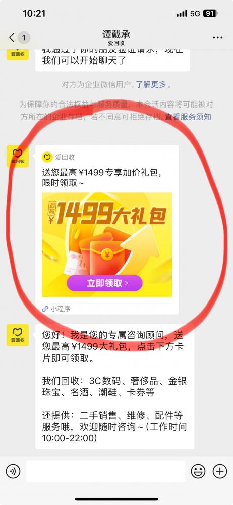 企业微信添加成功后会收到两条消息,点击红圈中的小程序点进去
